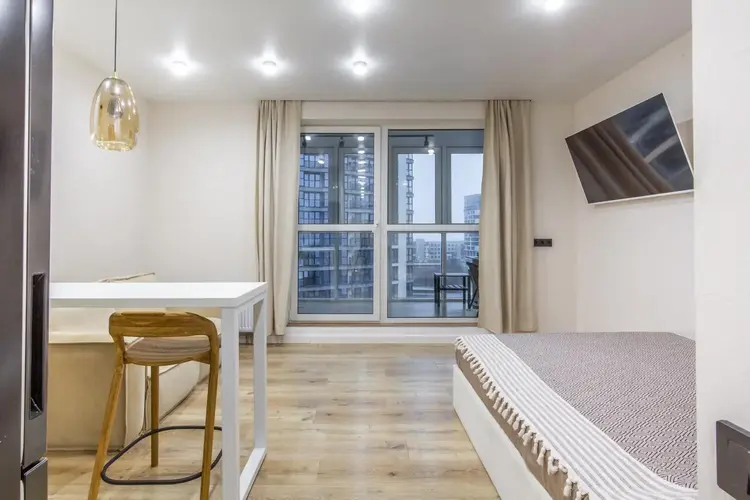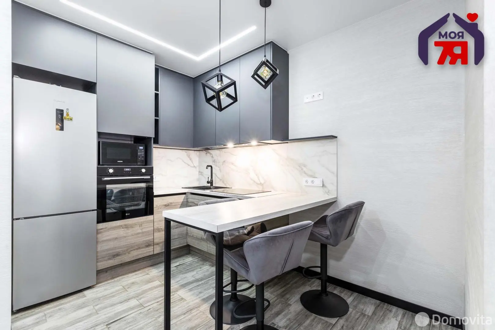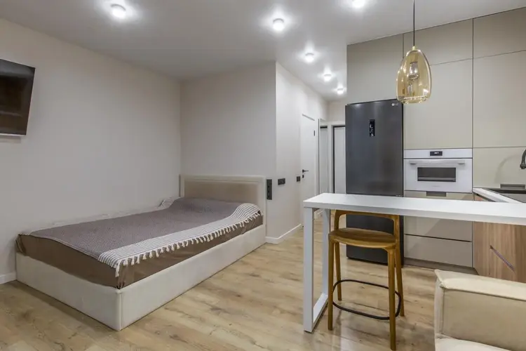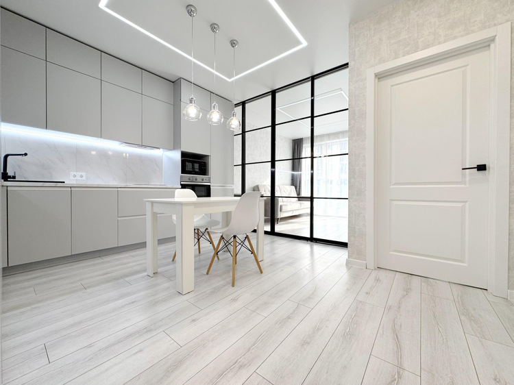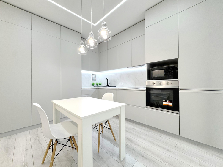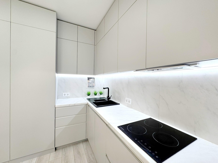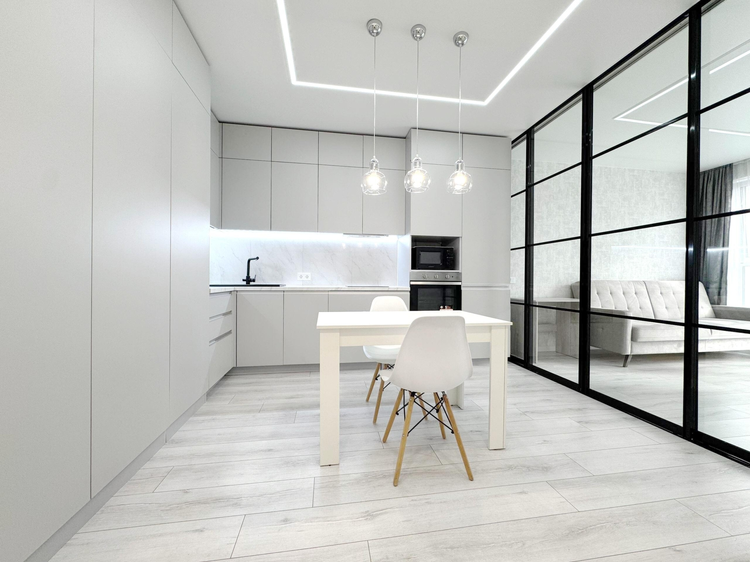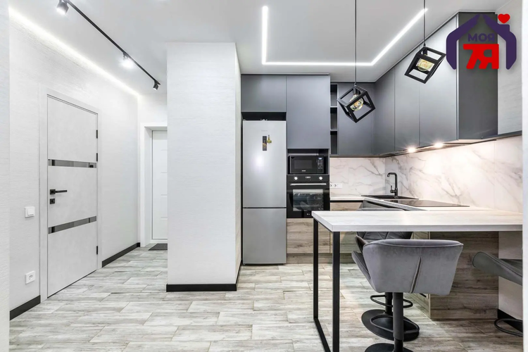 -Интерьер выполнен в едином современном стиле, без визуального шума и спорных решений. Кухня компактная, но функциональная: встроенная техника, подсветка рабочей зоны, фартук под камень, барная стойка вместо громоздкого стола - это экономит место и делает кухню удобной в повседневной жизни.