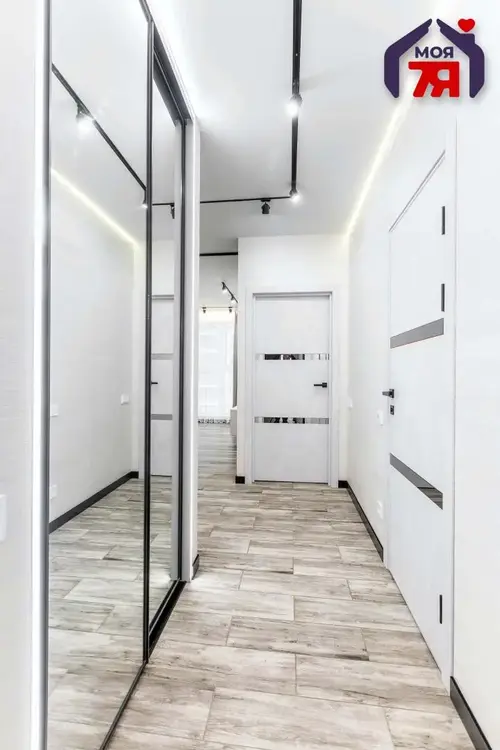 -Прихожая выдержана в общем стиле квартиры. Зеркальный шкаф увеличивает пространство и сразу решает вопрос хранения верхней одежды и обуви. Входная дверь массивная, с современными замками - ощущение надёжности с порога.