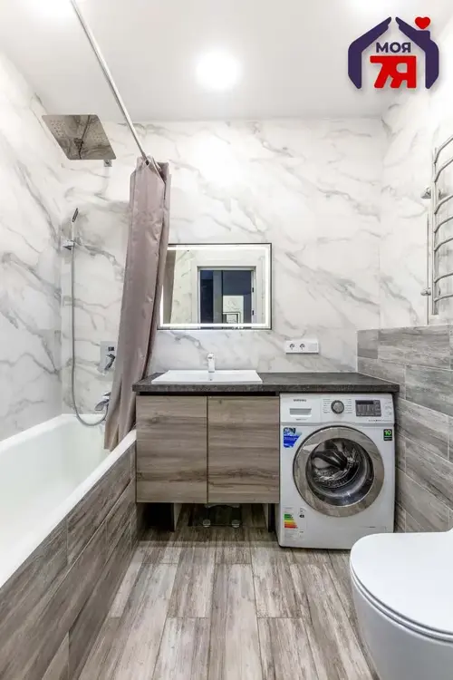 -Санузел совмещенный, облицован плиткой в спокойной серой цветовой гамме, установлена тумба с раковиной и встроенной стиральной машиной - всё компактно, функционально и без ощущения тесноты.