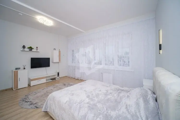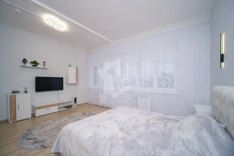 Просторная комната с окном на всю стену, что позволяет сделать дополнительное зонирование.