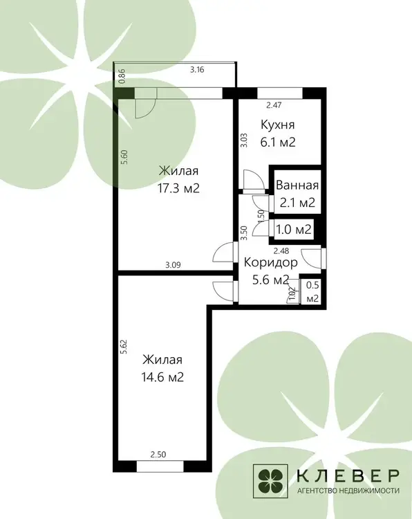 Квартира общей площадью 48.6 м2 по СНБ, с большой жилой комнатой 17.2 м2 и второй комнатой 14.3 м2