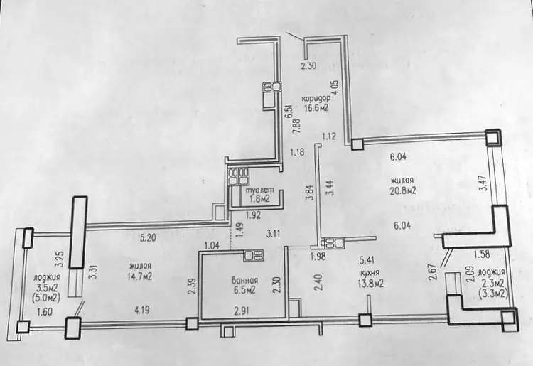 - площадь по СНБ — 80,0 м², общая — 74,2 м², жилая — 35,5 м²;