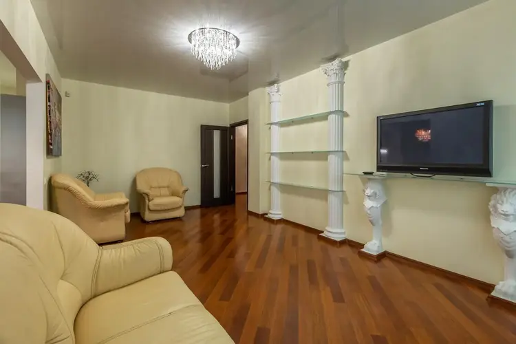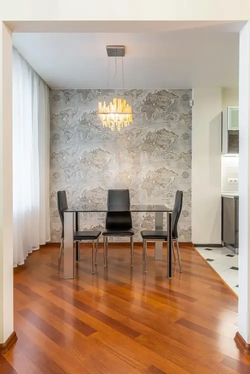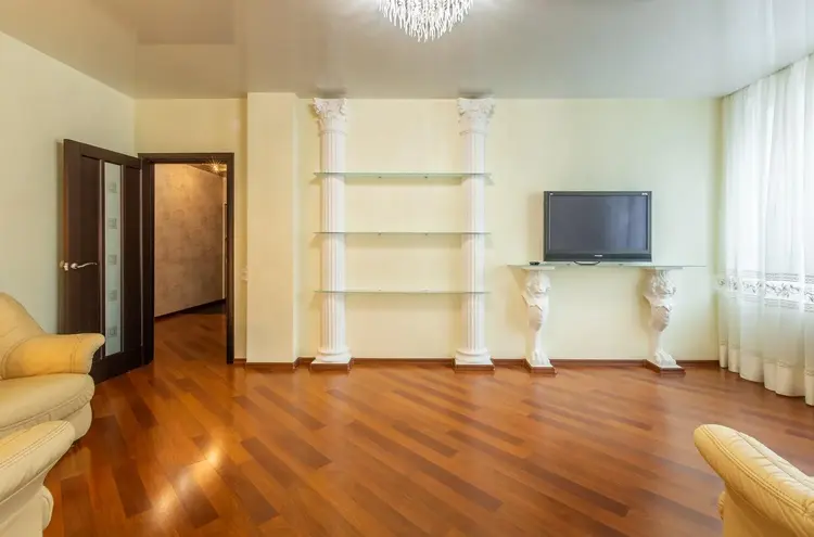 В жилых комнатах на полу ламинат хорошего качества. Часть стен в квартире окрашены моющейся краской, часть оклеены импортными обоями. Потолки натяжные.