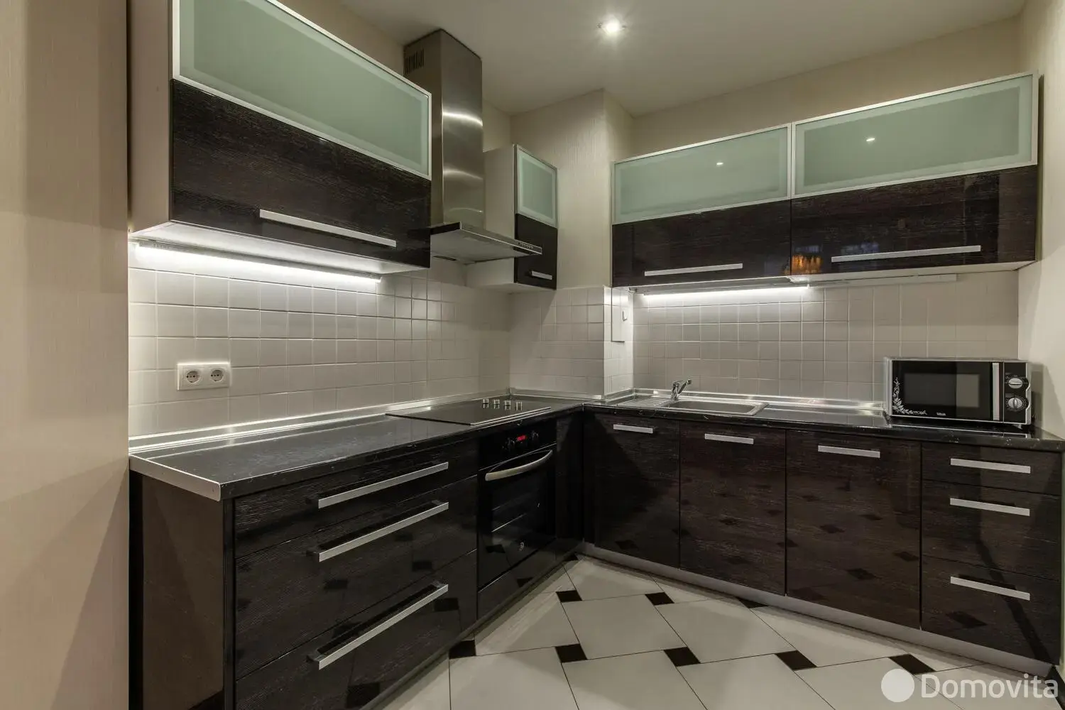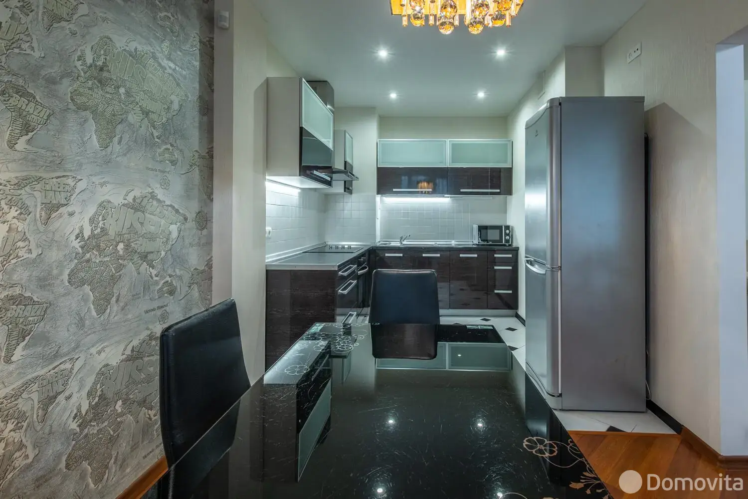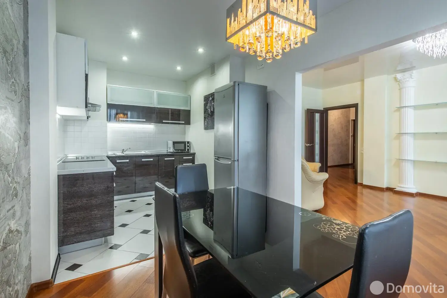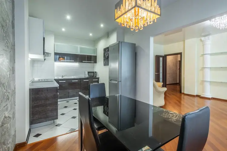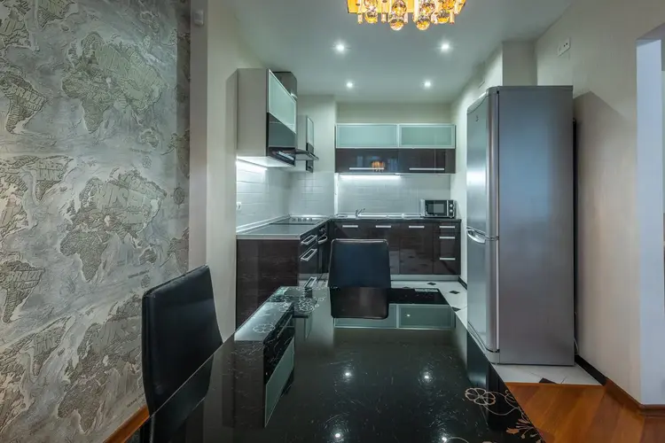 В квартире сделал хороший ремонт. Кухня почти 14м2. Встроенная кухня с импортной техникой фирмы Elite. Варочная панель, духовой шкаф, вытяжка, посудомоечная машина всё одной фирмы. Холодильник фирмы Indesit.