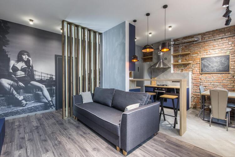 Ремонт выполнен по индивидуальному дизайн- проекту, выдержанному в стиле лофт, в пространстве воплощены самые смелые решения.