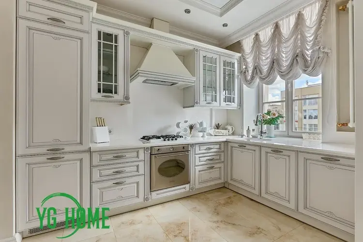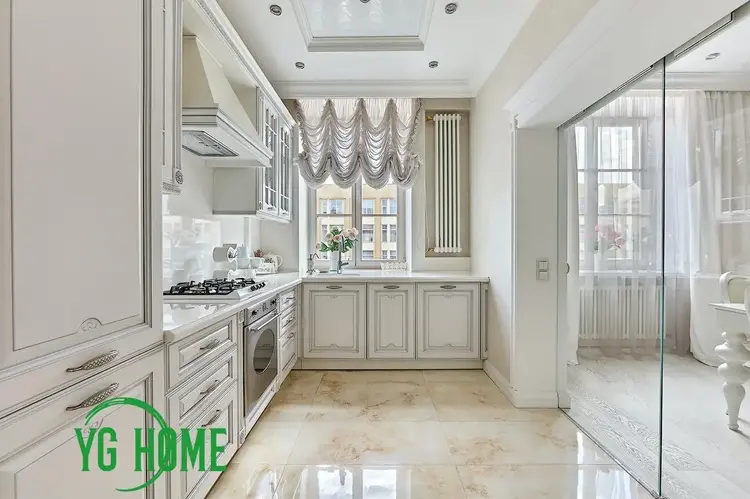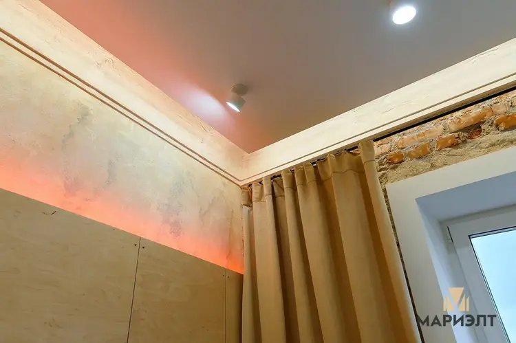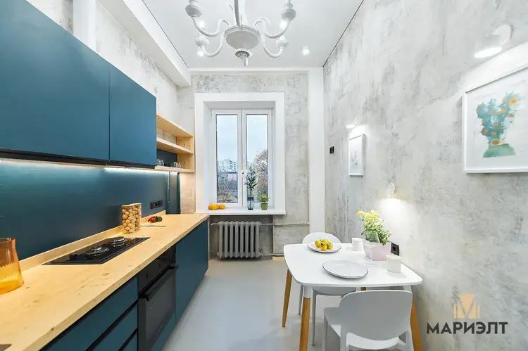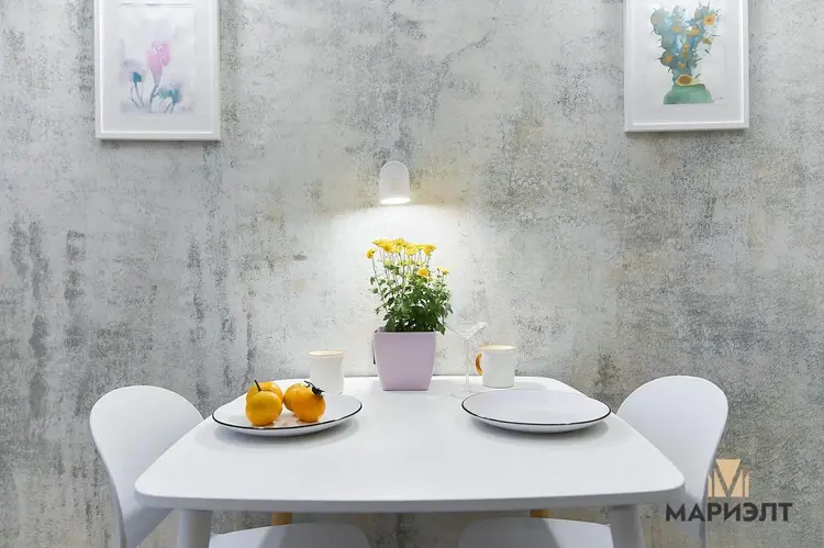 Современным и нестандартным дизайнерским решением было использовать в отделке пола кухни и санузлов микробетон (Hautmann). Очень стильно и неповторимо исполнено художественное декорирование стен.