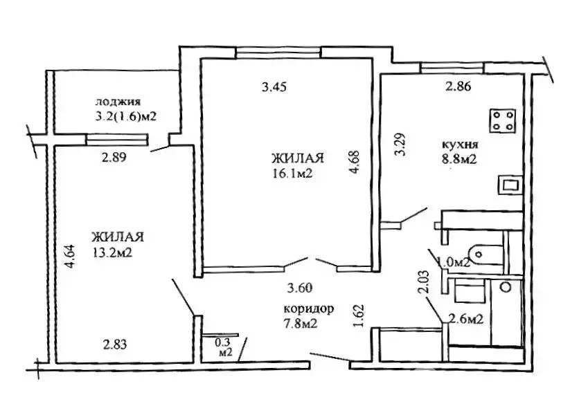 Квартира с улучшенной рациональной планировкой: две раздельные комнаты 13, 2 кв.м с выходом на застекленную лоджию 3.2 кв.м. и 16.1 кв.м, большая кухня 8.8 кв.м., просторный коридор 7.8 кв.м, раздельный санузел.