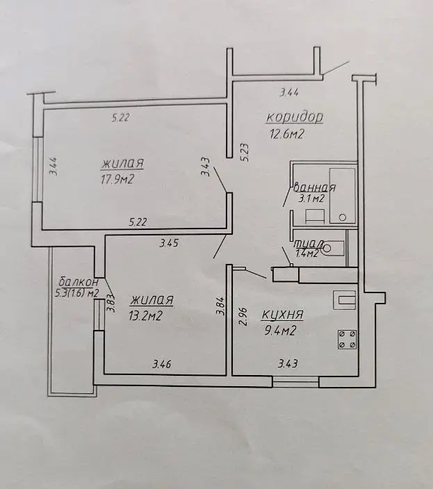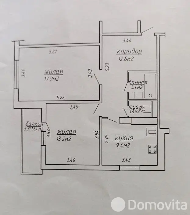 Общая площадь по СНБ 59,2 кв.м., жилая - 31,1 кв.м. Две раздельные просторные жилые комнаты (17,9 и 13,2 кв.м.) и отдельная кухня (9,4 кв.м.). Высота потолков - 2,63 м.
