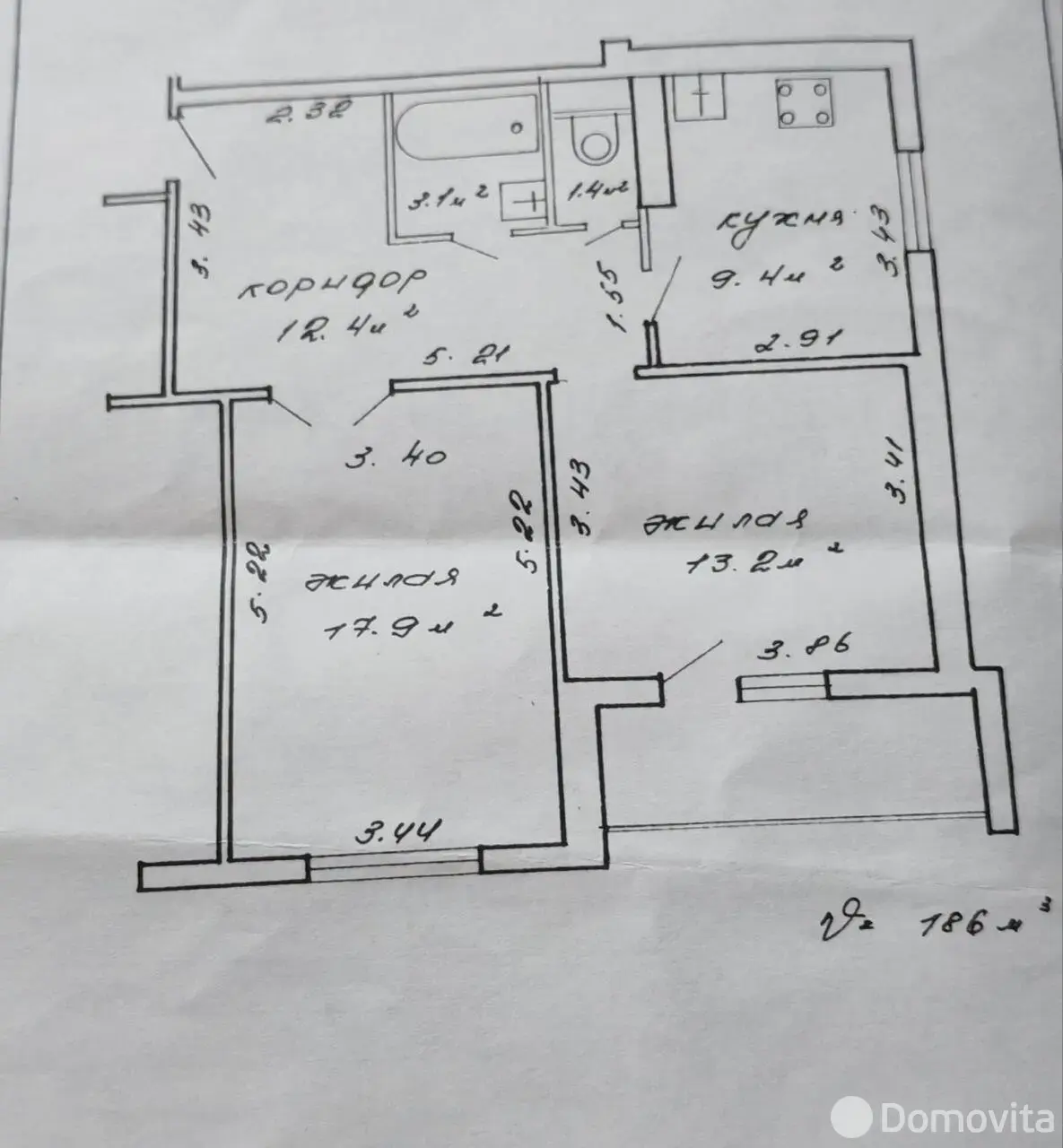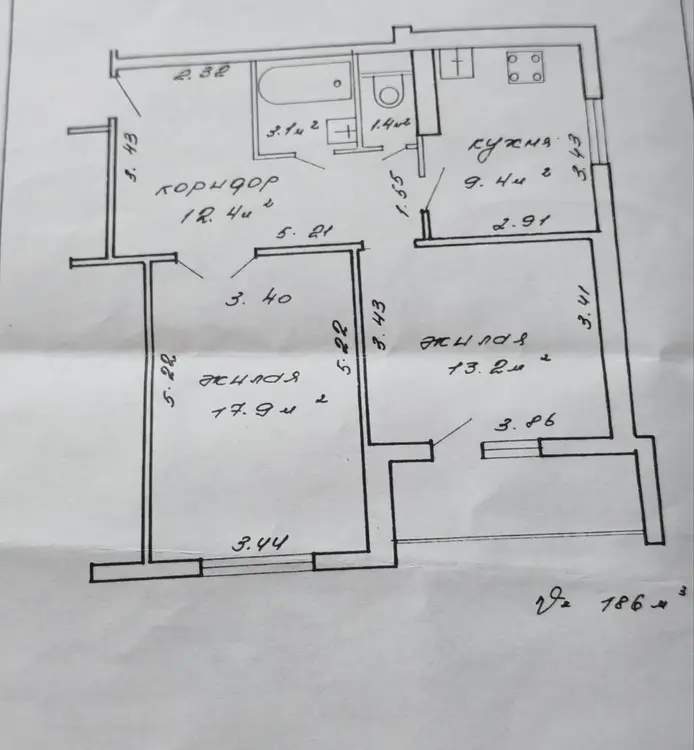 Площадь общая – 57,4 м2; жилая – 31,1 м2 (17,9 + 13,2 м2)