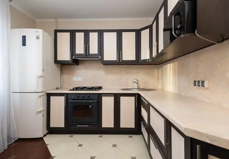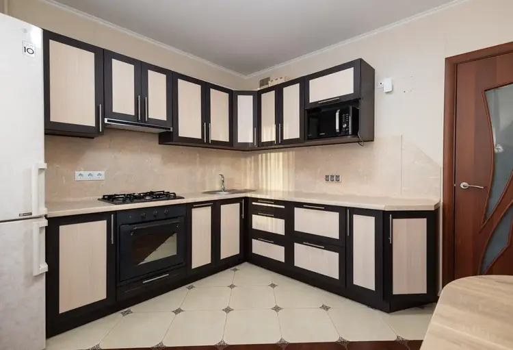 Кухня оборудована: духовой шкаф, газовая варочная поверхность, вытяжка, удобные шкафы.