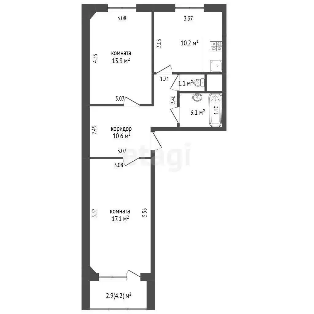 Кухня -10,2 м.кв, гостиная – 17,9 м.кв., изолированная комната – 13,9 м.кв., ванна – 3,1 м.кв., туалет – 1,1 м.кв., прихожая – 10,6 м.кв. с большим встроенным шкафом.