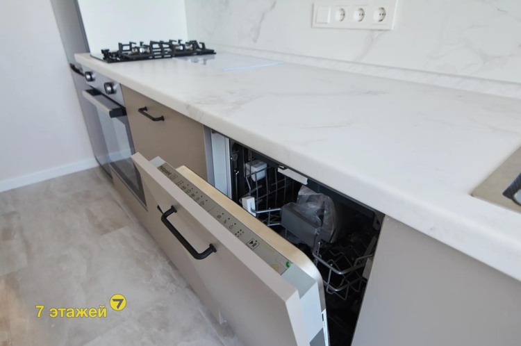 Кухня: площадью 6.90 м2., компактная, но с большим количеством мест для хранения, встроена вся импортная бытовая техника.