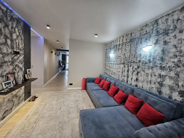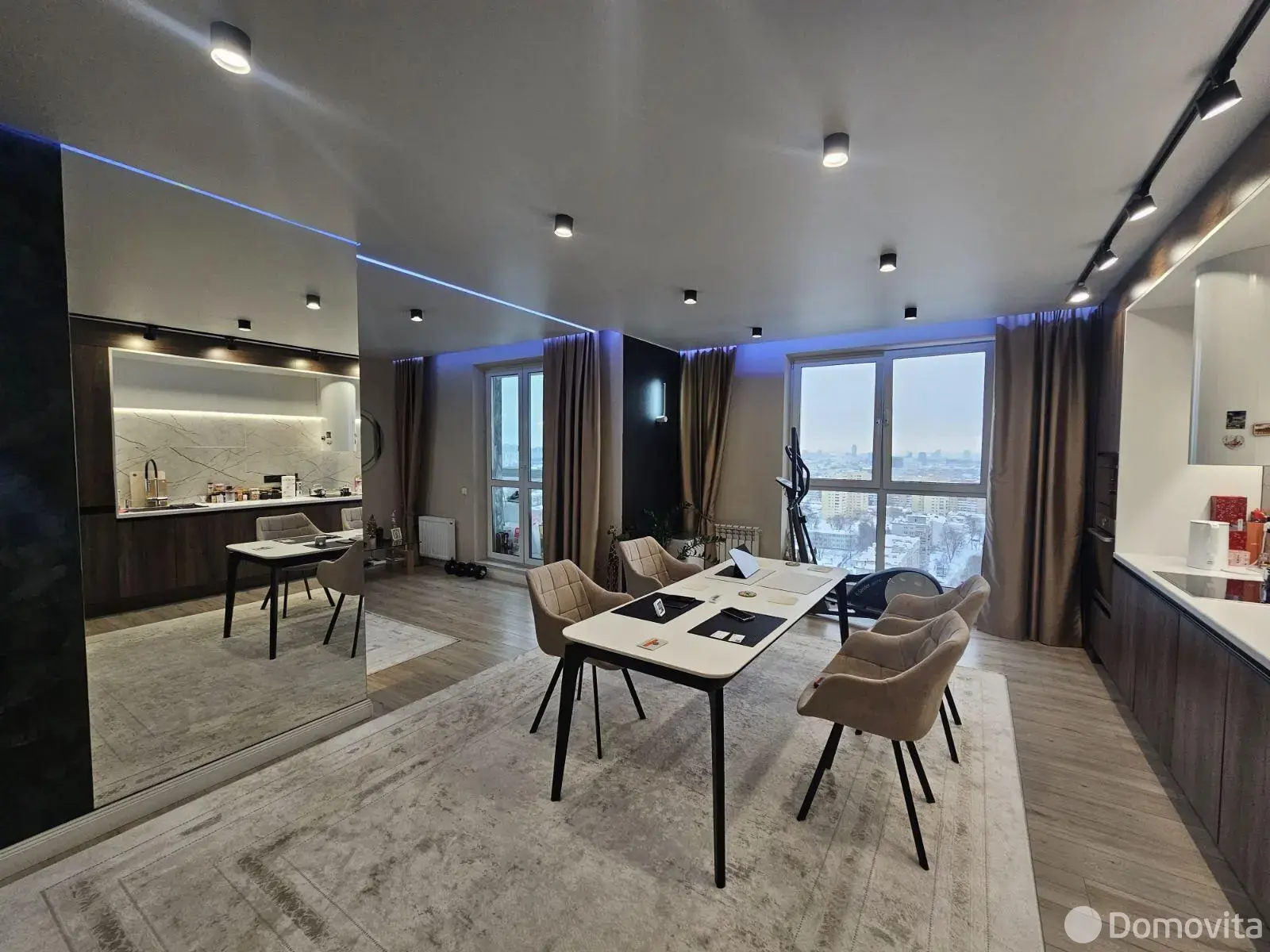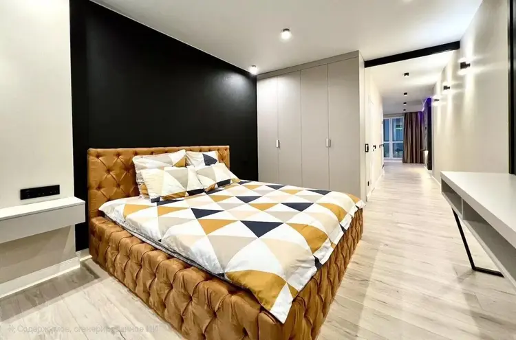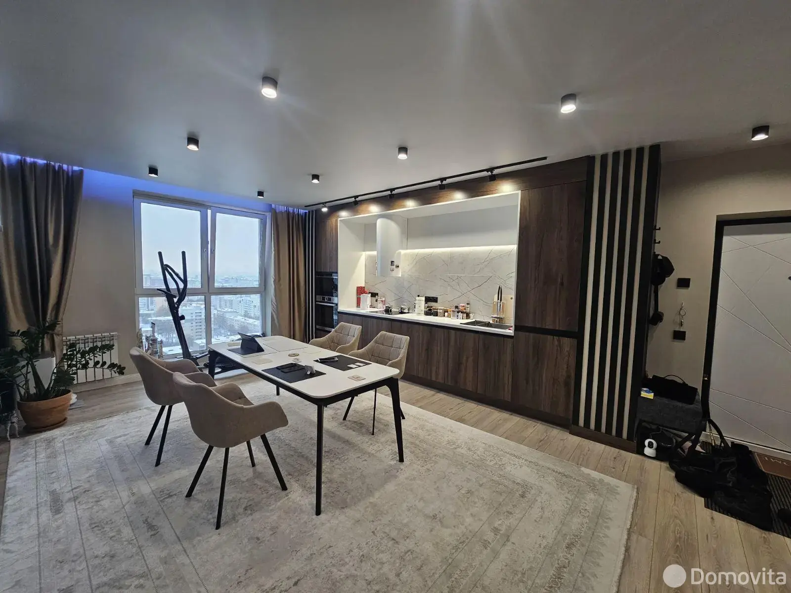 – Квартира со свободной планировкой: изолированная спальня и большая кухня-гостиная. На кухне обеденная группа, состоящая из стола и шести мягких кресел. Кухня с качественной фурнитурой и фасадами из нанопластика soft touch.