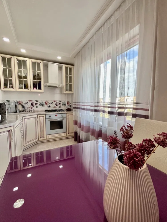- Отделка помещений выполнена в едином спокойном стиле. На кухне пол из линолиума, стены оклеены обоями, потолок окрашен, двери деревянные. Установлена встроенная кухня, остаются холодильник, стол и газовая поверхность. Из кухни есть балкон, полностью замененный при капитальном ремонте. В коридоре, зале и спальне также линолиум на полу, обои на стенах и окрашенные потолки, двери деревянные. В спальне окна в пол и балкон, замененный при капитальном ремонте.