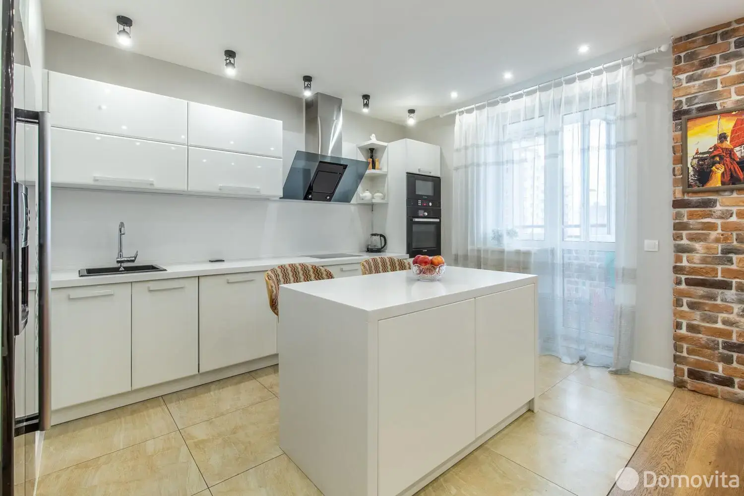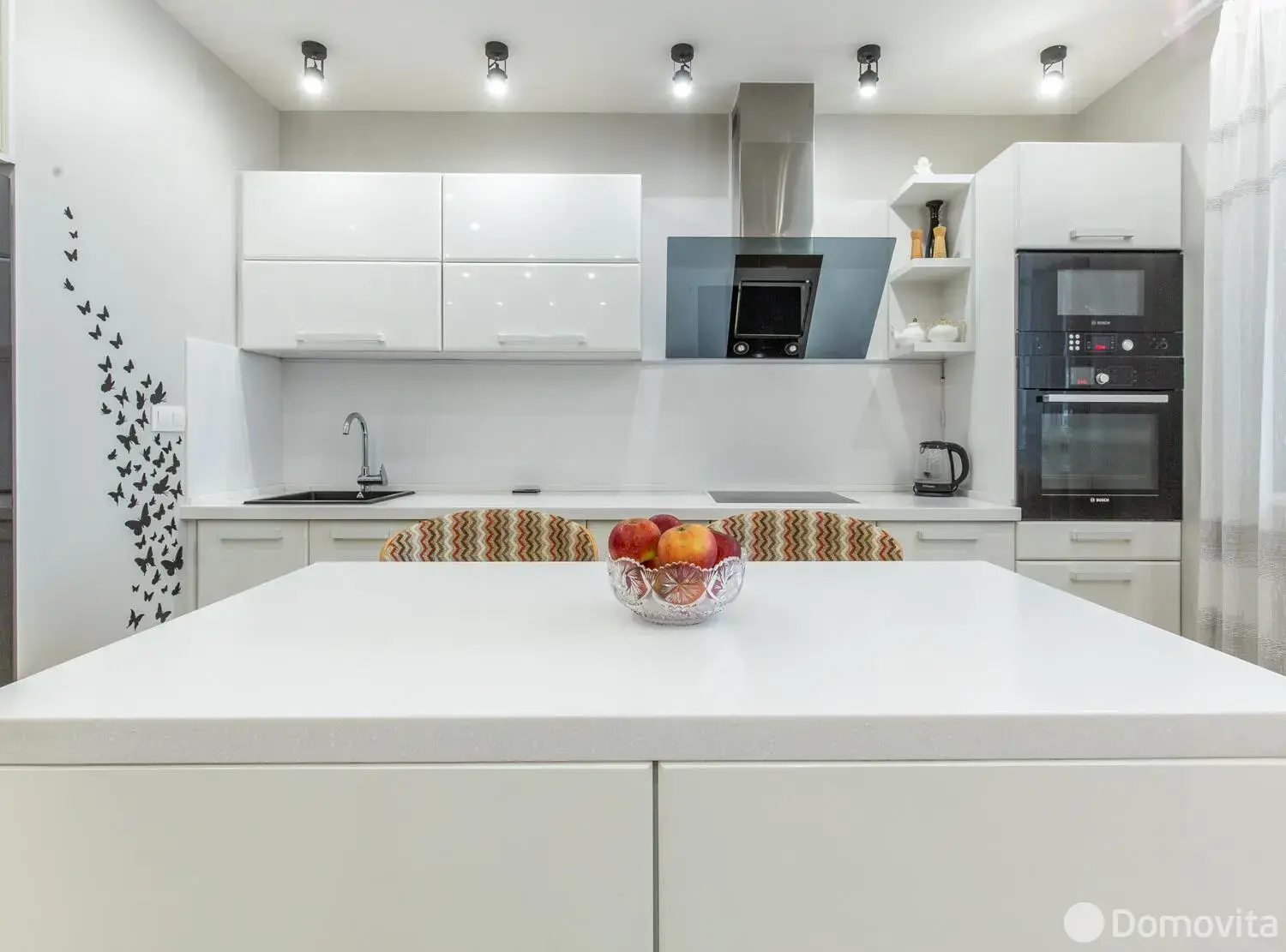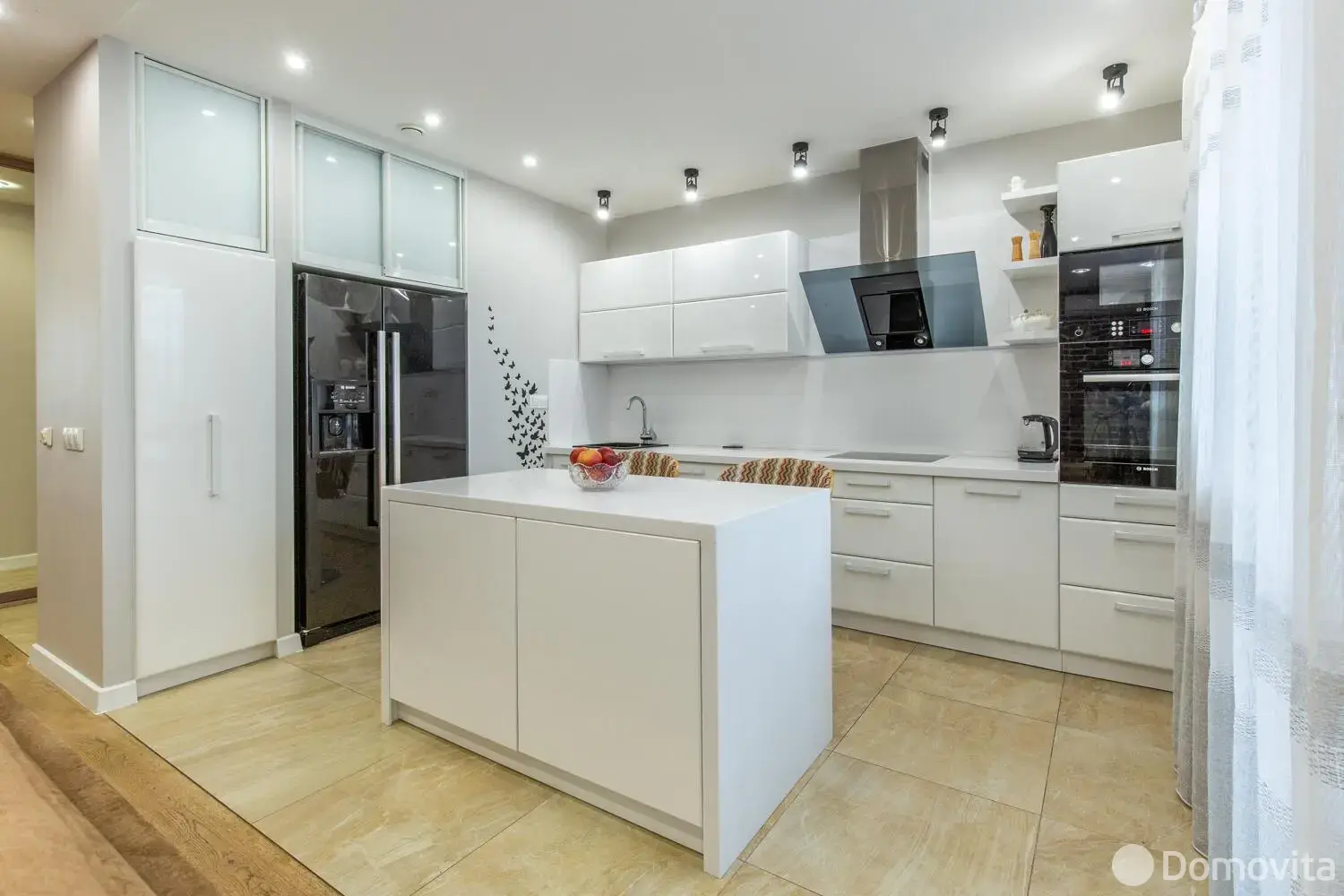 Встроенная кухня с системой выдвижения BLUM и бытовой техникой: варочная панель, духовой шкаф, холодильник, посудомоечная и стиральная машины, микроволновая печь BOSCH, мощная вытяжка SHINDO.