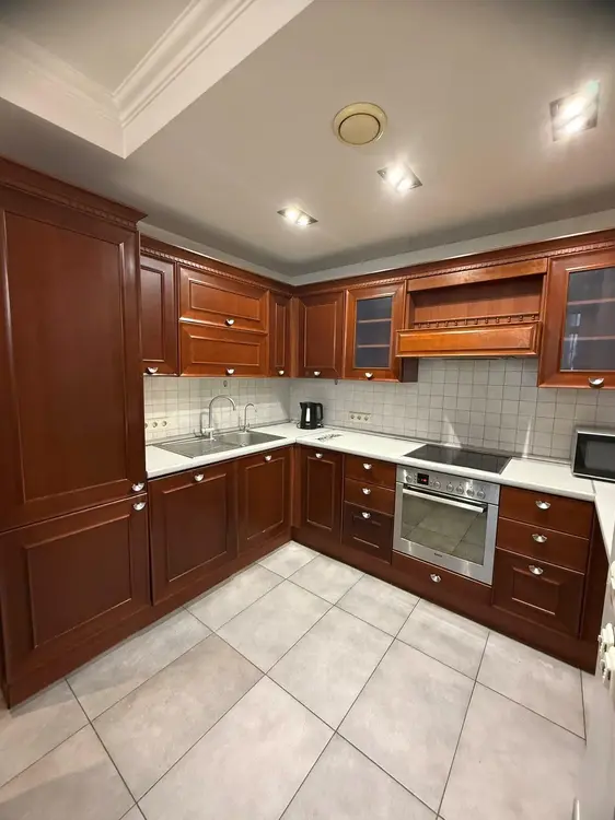 Кухня оборудована встроенной бытовой техникой премиум-класса от немецкого производителя NEFF, включая: духовой шкаф с многофункциональными режимами, индукционную варочную поверхность с сенсорным управлением, вытяжку с высокой производительностью и бесшумной работой, стиральную машину с интеллектуальной системой дозирования моющих средств и автоматическую кофемашину с возможностью приготовления различных кофейных напитков.