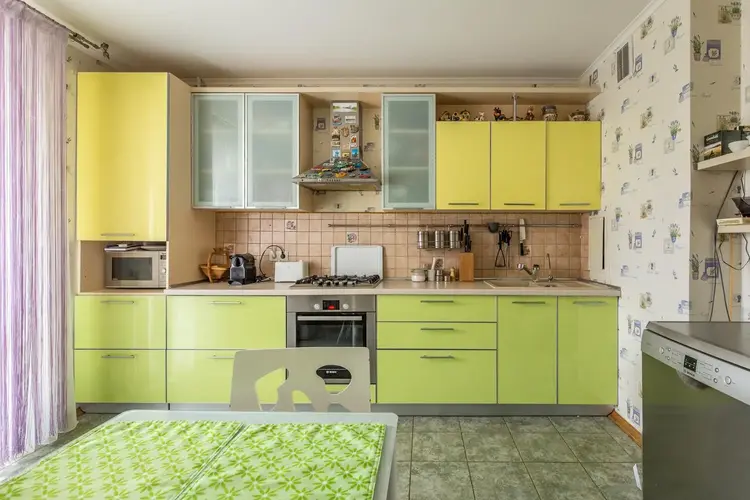 Большая светлая кухня оборудована мебелью и техникой.