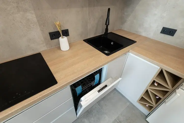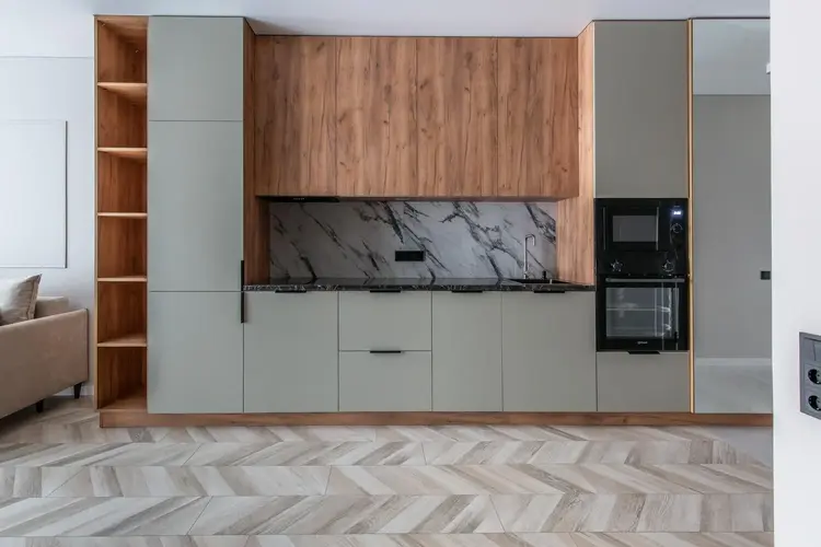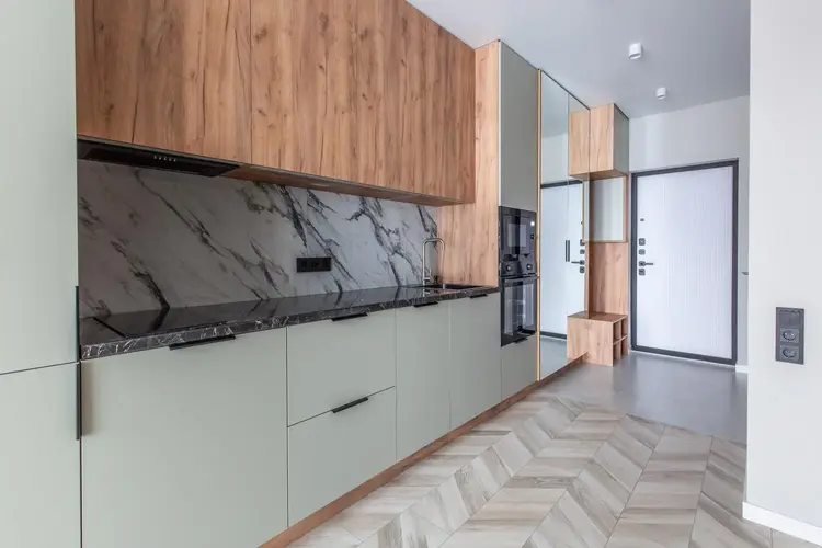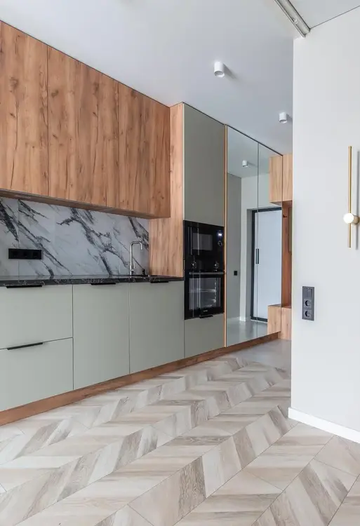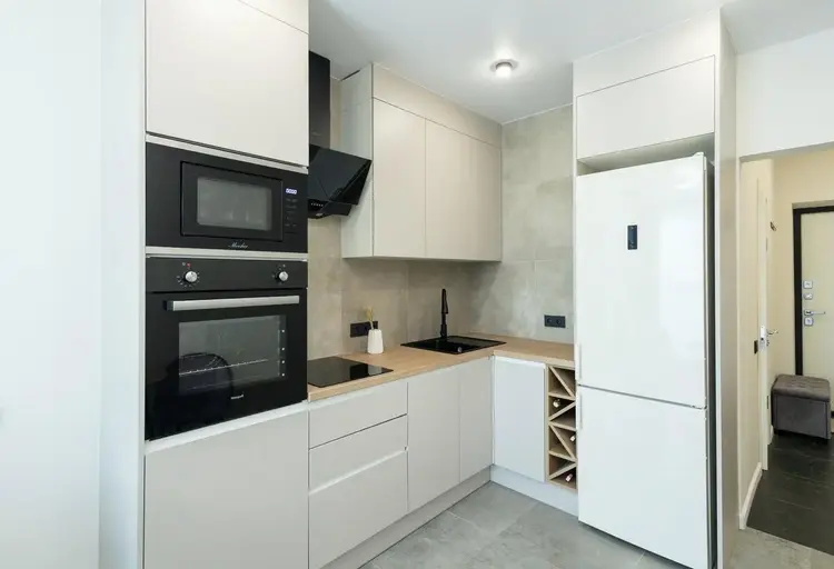 Кухня-гостиная — со всей необходимой встроенной техникой, включающая в себя: посудомоечную машину, холодильник, варочную панель, духовой шкаф — всё, что нужно для удобной жизни
