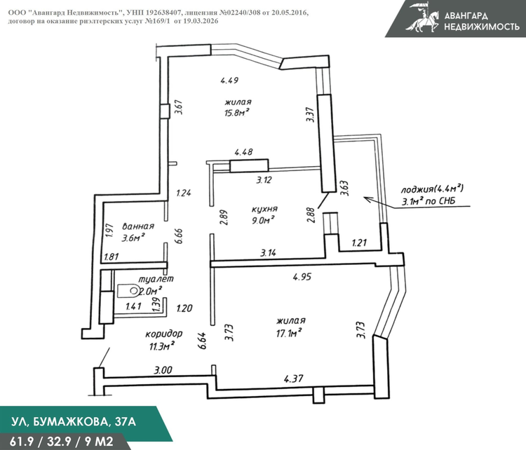 Площадь квартиры по СНБ 61.9 м2. Высота потолков составляет 2.53 м. Квартира с удобной планировкой и с панорамным видом из окон, кухней-гостиной 15.8м2 с большой и удобной ванной комнатой и 2-мя изолированными спальнями и застекленной лоджией.