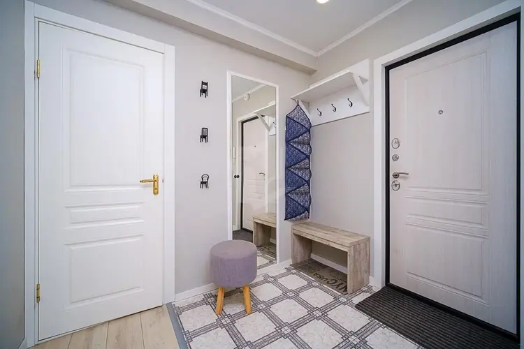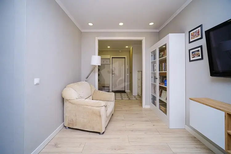 В квартире выполнен элегантный и лаконичный ремонт, продуманный до мелочей. В комнатах на полу – ламинат. Гостиная объединена с кухней, оборудованной современной бытовой техникой (в том числе, и посудомоечной машиной). Хватило места вместительной гардеробной в спальне и просторной кладовке в прихожей. Лоджия благоустроена и оформлена в едином стиле с квартирой