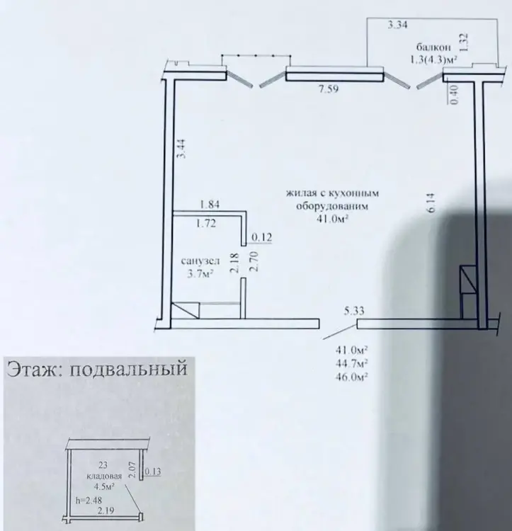 Площадь по СНБ: 46 кв. метров, с балконом + КЛАДОВАЯ 4.5 кв. метров = 50,5 КВ.МЕТРОВ