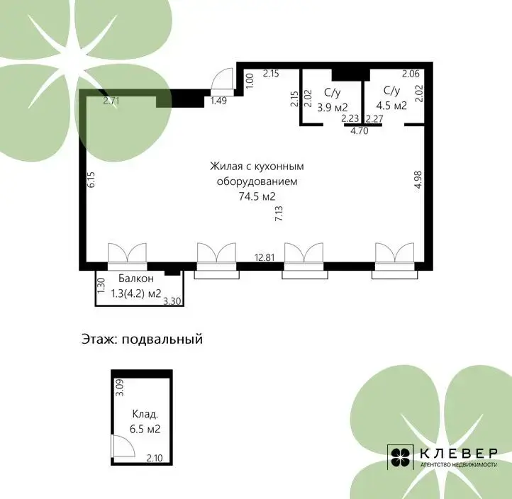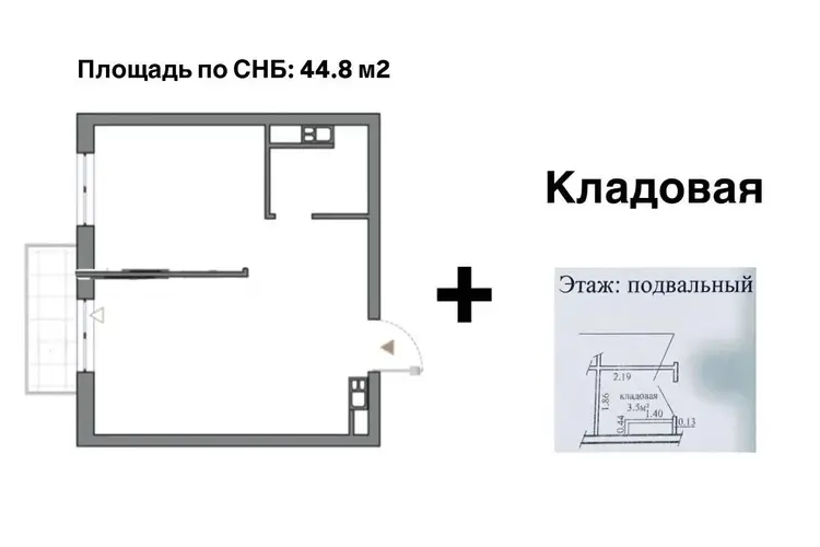 Площадь по СНБ: 44,8 кв. метров, с балконом + КЛАДОВАЯ 3,5 кв. метров = 48,3 КВ.МЕТРОВ
