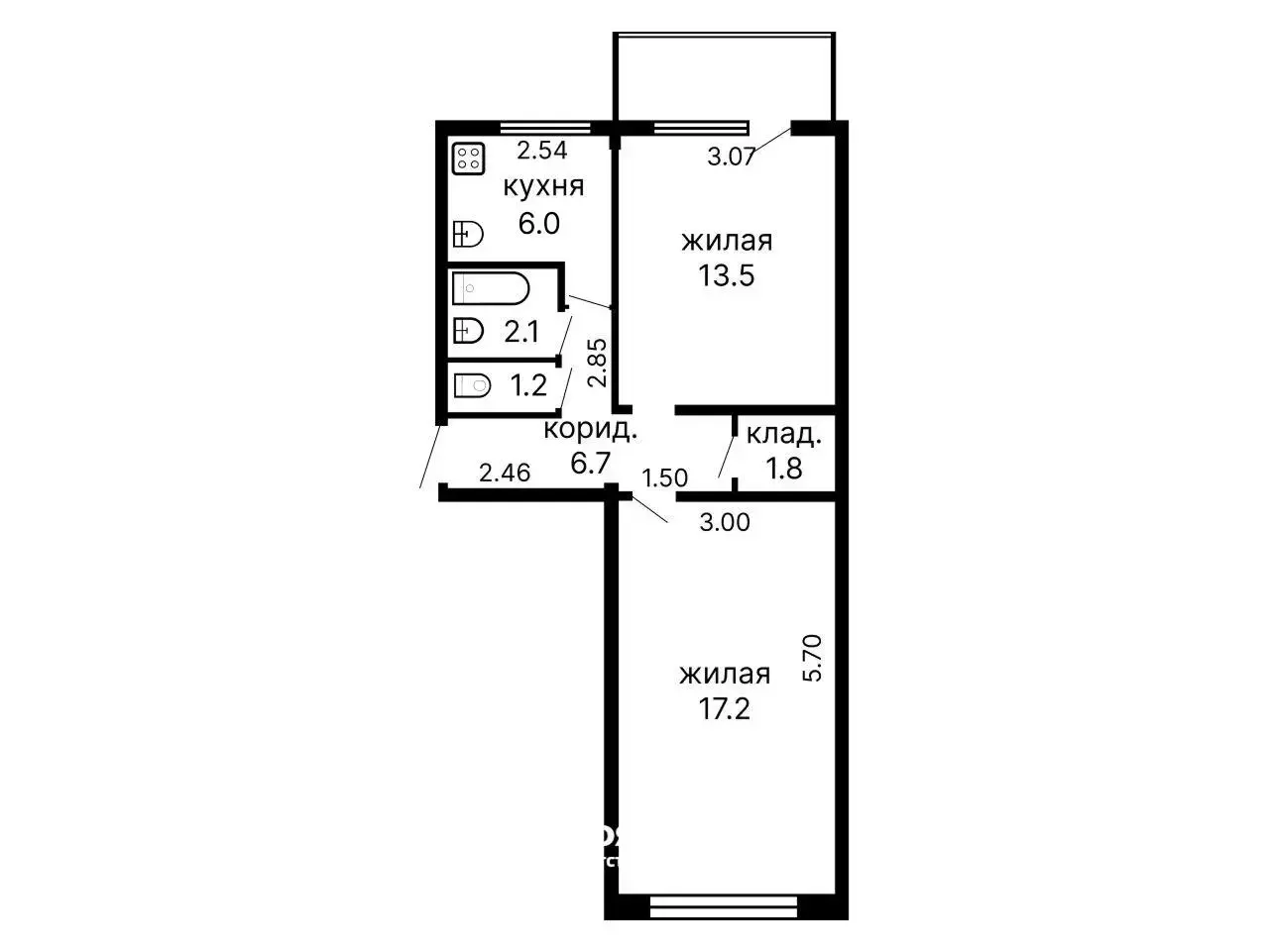 Общая площадь: 49.2 (СНБ). Жилая площадь: 36.6. Площадь кухни: 6.0. Высота потолка: 2.5.