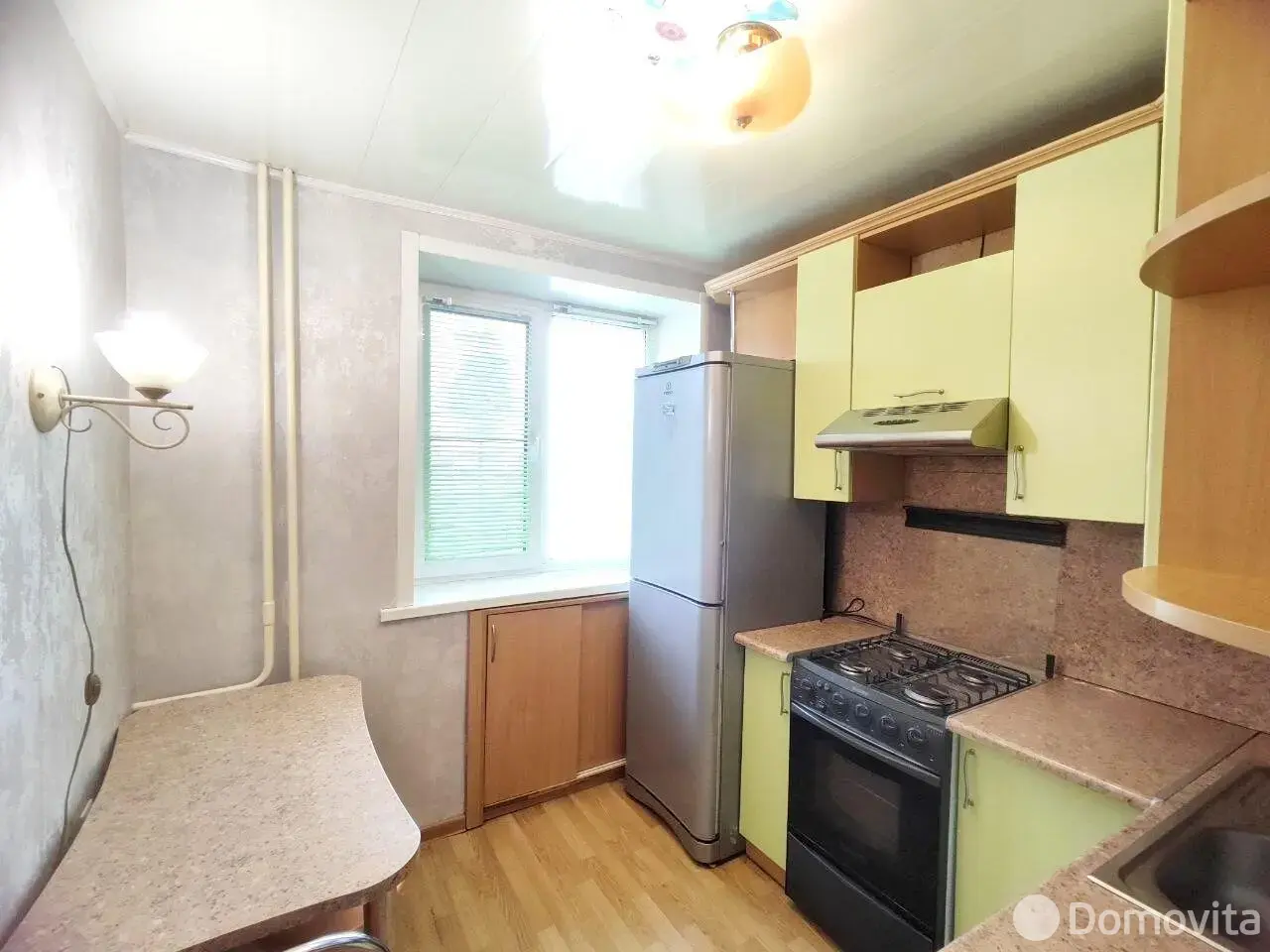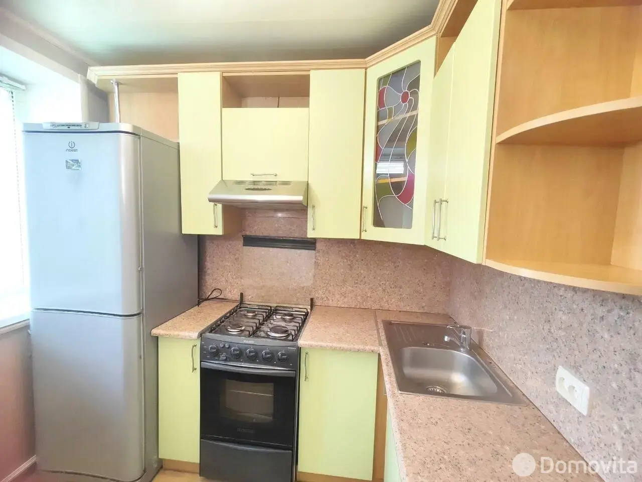 Встроенная кухня с бытовой техникой (газовая плита, вытяжка, холодильник).