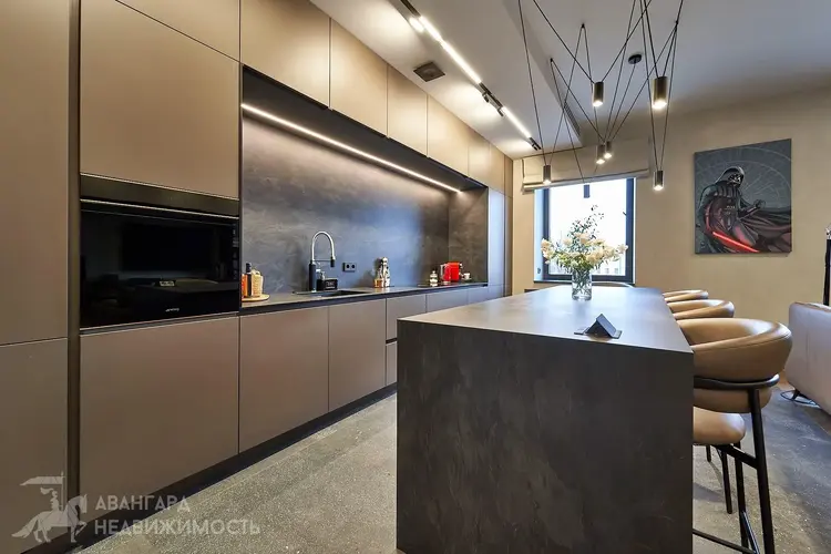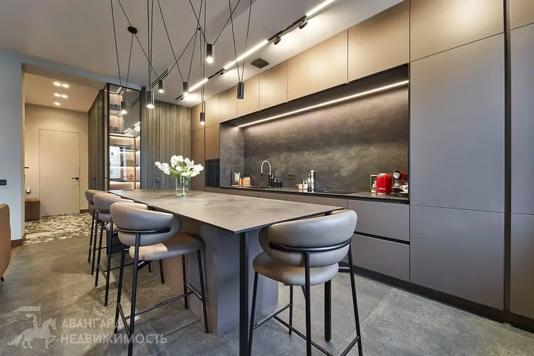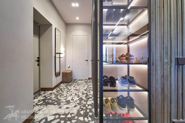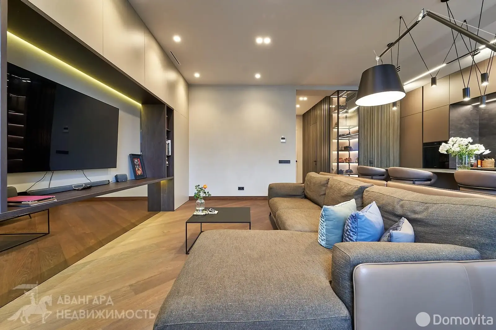 Площадь квартиры по СНБ 59,8 м2, жилая площадь составляет 49,2 м.2. В квартире был произведен полный демонтаж старого ремонта (потолки, стены, пол и коммуникации), была произведена замена всего от дверей, окон, до сантехники и электрики, даже потолочные перекрытия. В квартире установлена система «умный дом», приточно-вытяжная система вентиляции и кондиционирование. На полу паркетное покрытие, ремонт выполнен из дорогих и современных материалов. Перепланировка была узаконена.
