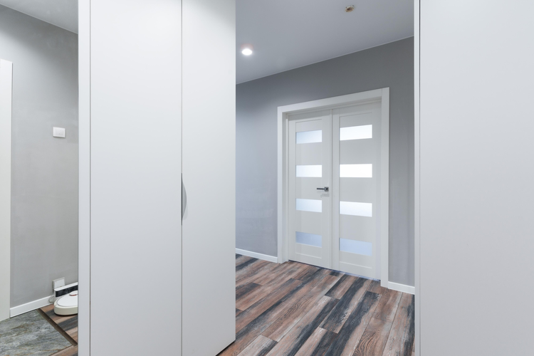 В просторном коридоре установлен шкаф – купе с организованной системой хранения, напольное покрытие плитка и ламинат