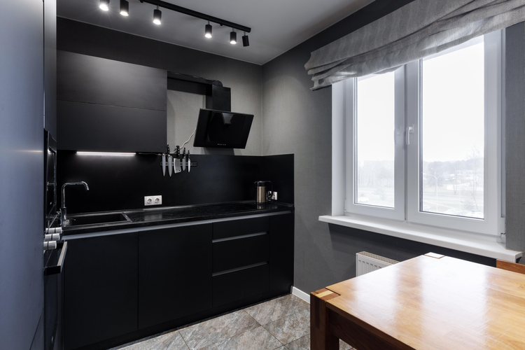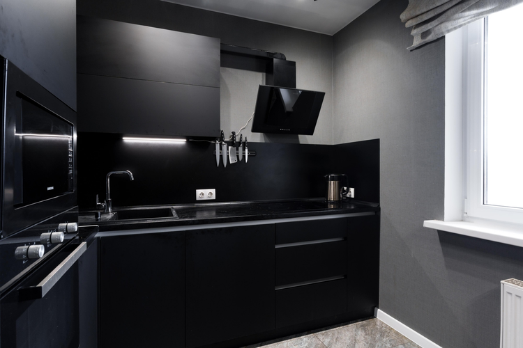 Кухня в нестандартной цветовой гамме укомплектована импортной техникой