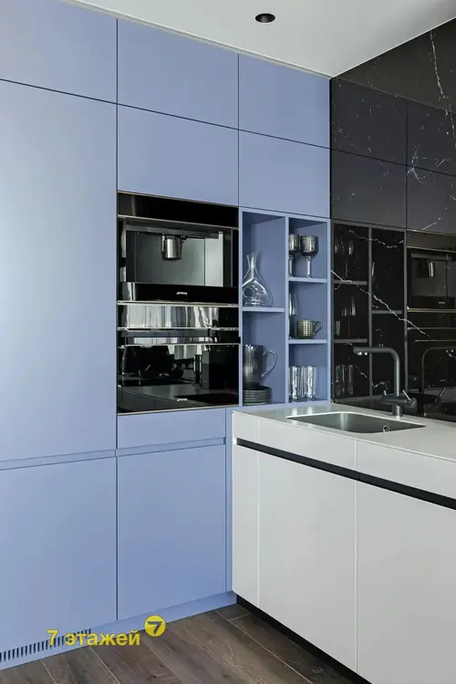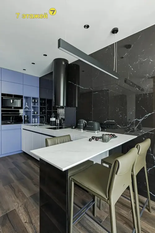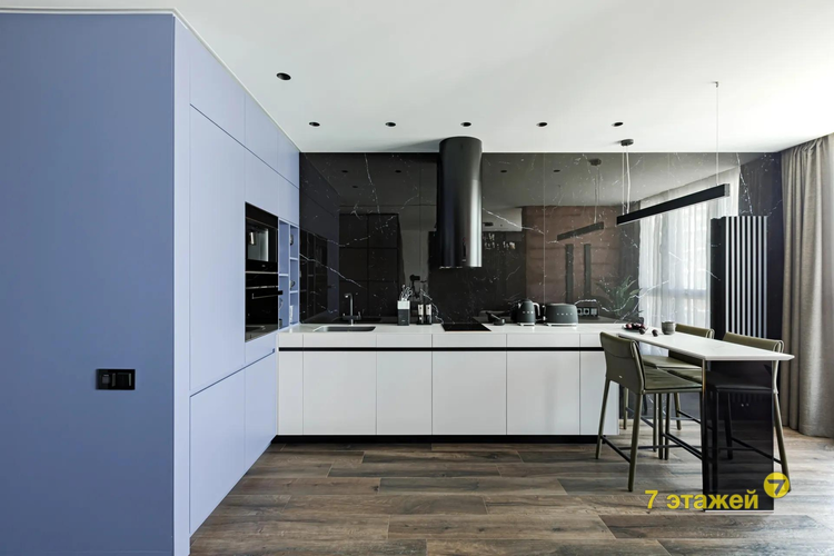 Встроенная кухня укомплектована современными и высококачественными бытовыми приборами, включая индукционную варочную плиту SMEG, духовой шкаф с функцией СВЧ SMEG, встроенная кофемашина SMEG, вытяжку, посудомоечную машину BOSCH и холодильник фирмы LIEBHERR, вся техника импортного производства. Система скрытых направляющих BLUM для кухонной мебели. Невероятный стиль и фишку придают кожаные барные стулья фирмы CATTELAN (Италия) оливкового цвета. Высота потолков 2,71 .