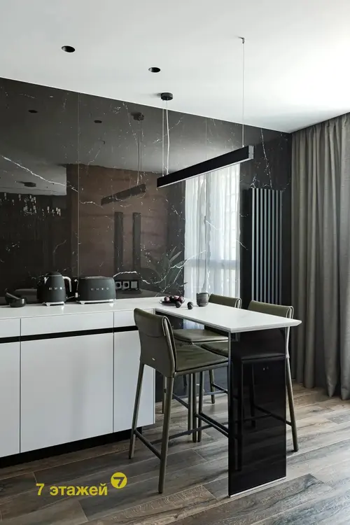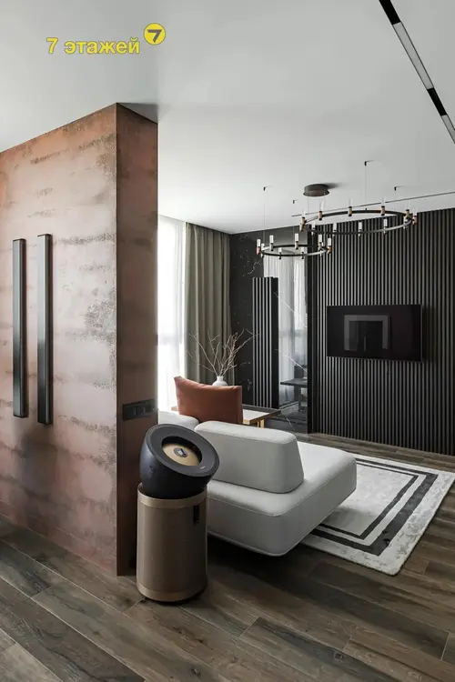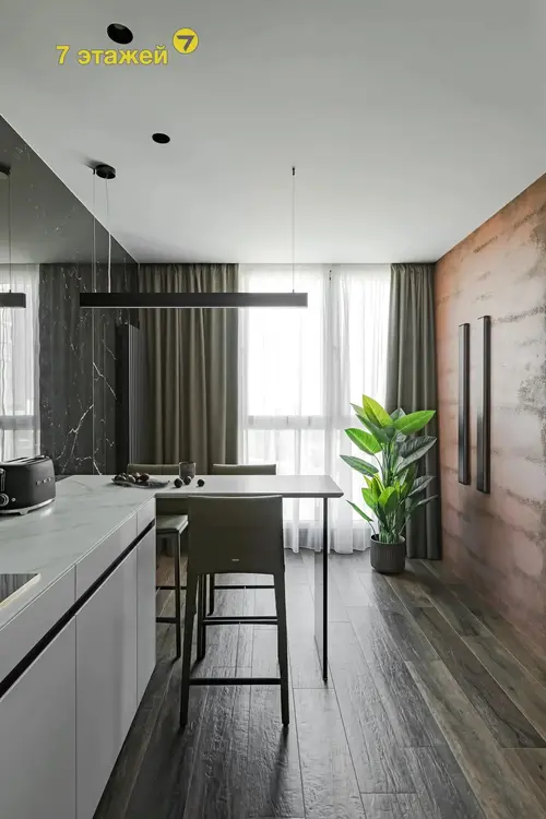 Одним из ключевых преимуществ этой квартиры является применение современных технологий. Потолки идеально выровнены и отделаны, а трековые светильники добавляют современности и функциональности. Для каждой из зон квартиры предусмотрены несколько сценариев освещения. На полу – итальянская керамогранитная плитка, теплый пол во всей квартире, управление которыми осуществляется при помощи пульта. Стены отделаны цементной штукатуркой, известной своей прочностью и влагостойкостью. Все окна панорамные. В квартире создан авторский дизайн - проект студией архитектуры и дизайна интерьера "Квартира №17.