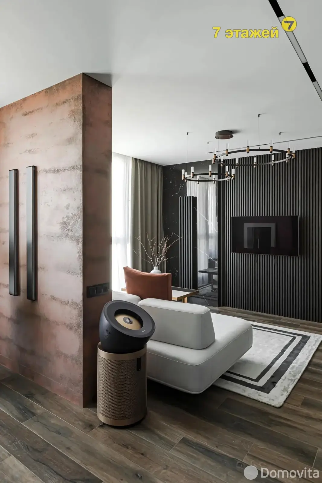 Кухня, гардеробная, сан.узел, кровать и журнальный стол изготовлены по индивидуальному заказу DOMANI, что подчеркивает эксклюзивность этого пространства и качество. Двери , а также перегородка и декоративные рейки на стенах фирмы LAZZIO. Современная сантехника в санузле и кухне фирмы VILLEROY&BOCH. В сан. узле установлен бойлер. В квартире есть кондиционер GREE.