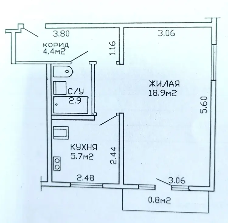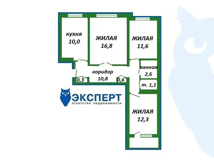 Площадь квартиры по СНБ - 62,4 м.кв., просторная кухня - 10,2 м.кв.!