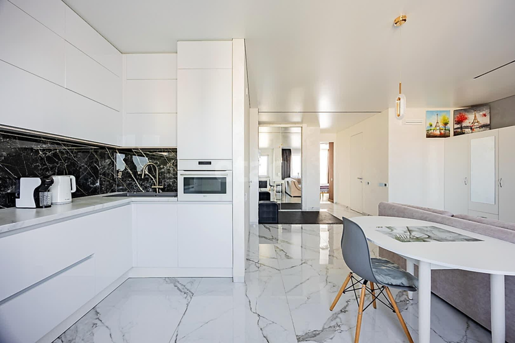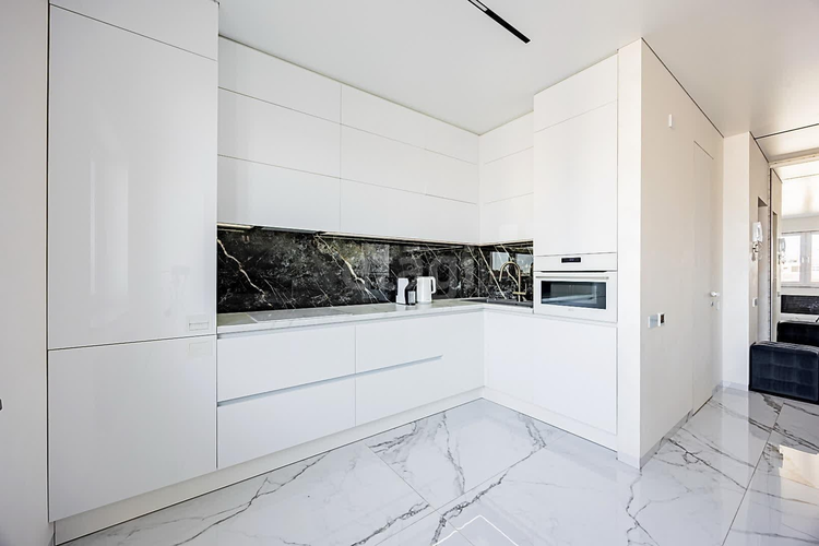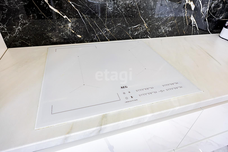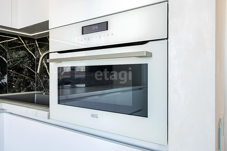 - кухонный гарнитур оборудован всей необходимой техникой ведущих производителей, встроенный холодильник AEG на 207 + 60 л, варочная панель AEG, кухонная вытяжка Elica, Электрический духовой шкаф AEG на 43 литра с функцией микроволновки, кухонная мойка Blanco Dalago 8, смеситель Omoikiri, встраиваемая посудомоечная машина Bosch, большое количество мест хранения для посуды и ваших продуктов