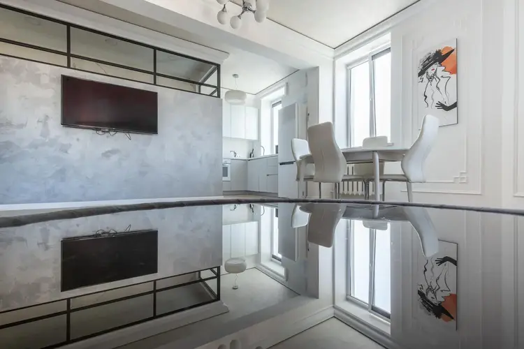 Пространство выдержано в светлых тонах с яркими цветовыми акцентами. Кондидионер, абсолютно вся мебель, бытовая техника (вплоть до посудомоечной машины и бойлера), шторы, зеркала, картины, вазы и прочие детали идеально вписываются в этот эксклюзивный интерьер.