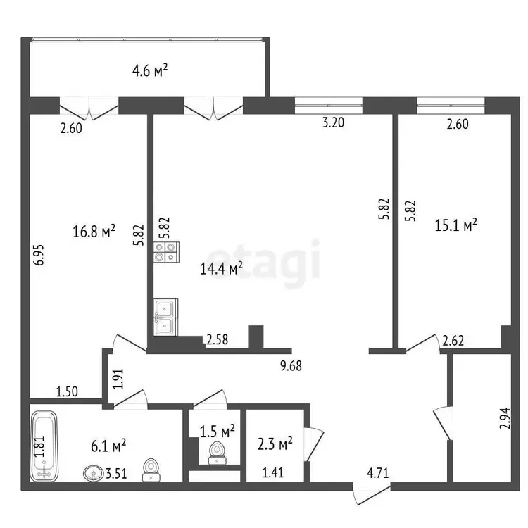 Общая площадь 45.1 кв. м, жилая 32.9 кв. м, кухня 6.3 кв. м.