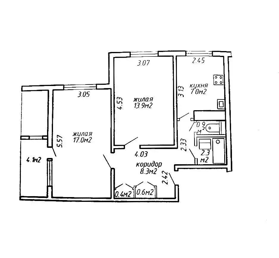 Очень хорошее расположение дома. Площадь квартиры по СНБ – 54,5м2; жилые комнаты 13,9м2 и 17,0м2.; двойная лоджия.
