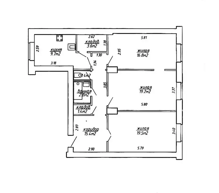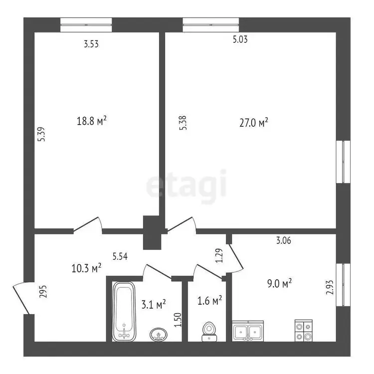 Общая площадь 69.8 м2Просторные комнаты 27. м2, 18.8 м2