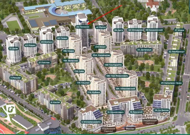 • Зеленая зона — бульвар Пикассо прямо на выходе из подъезда