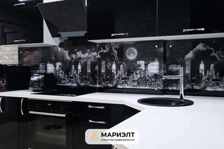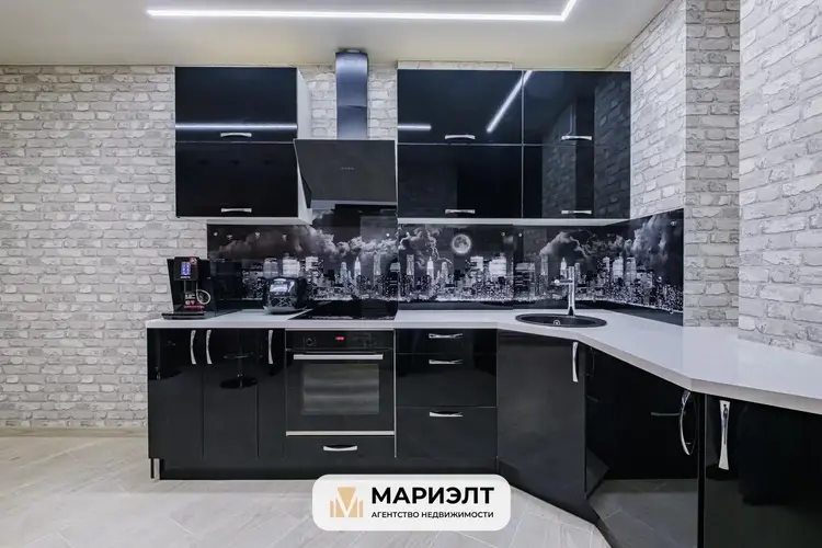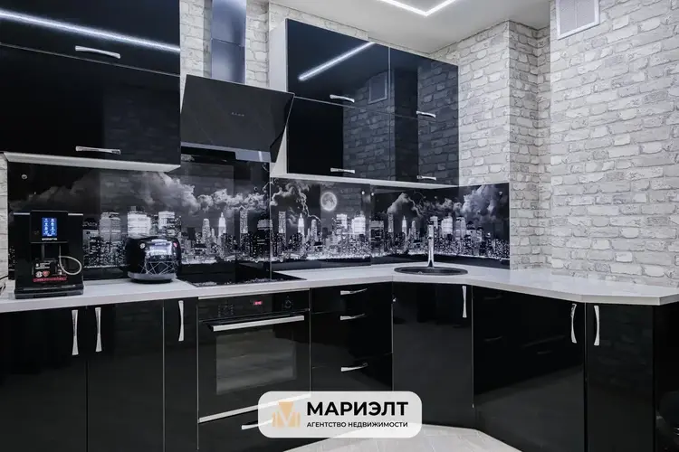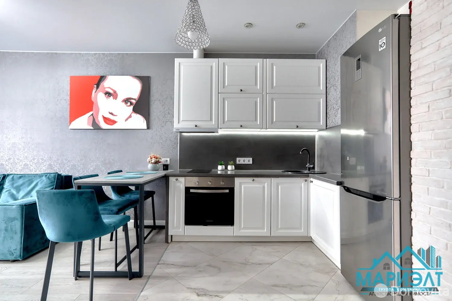 Гостиная, совмещённая со встроенной кухней, оснащенной современной бытовой техникой .