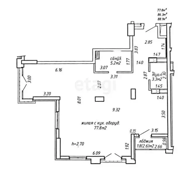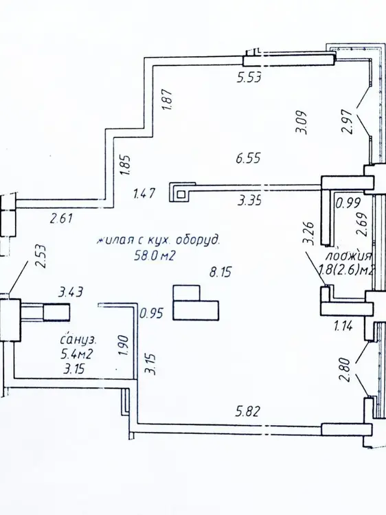 Общая площадь по СНБ – 57.0 м2, жилая площадь 28.1 м2