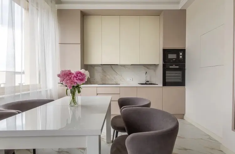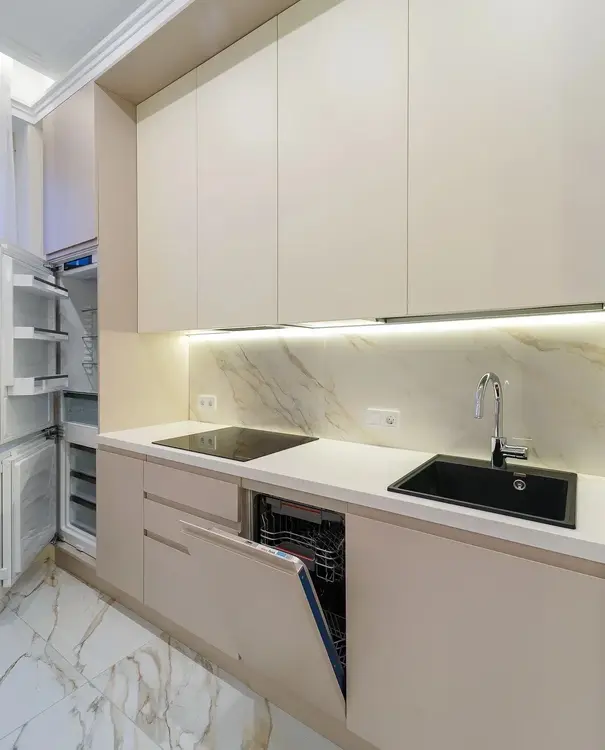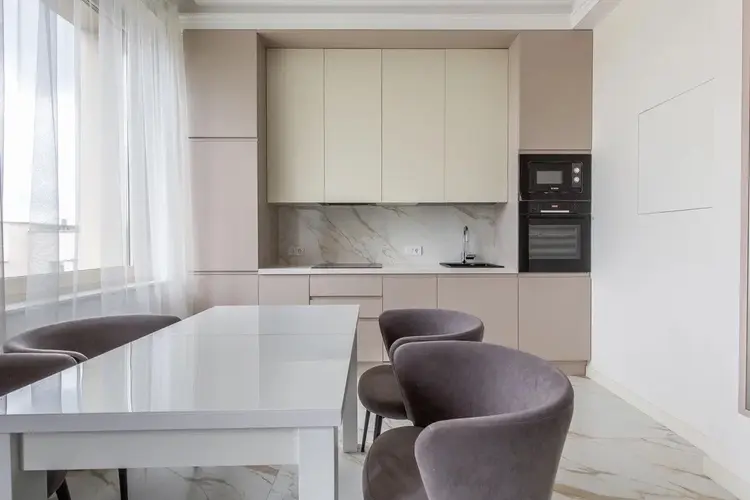 Кухня-гостиная: площадью 27 м2. Пространство визуально разделено на зону кухни и гостиной, большое количество света. Во всю стену установлен шкаф-витрина с подсветкой, каменная столешница, установлена вся необходимая мебель и техника. Микроволновая печь, духовой шкаф, индукционная панель и посудомоечная машина марки Bosh, вытяжка Elica, холодильник Liebherr. Вся техника привезена из Европы.