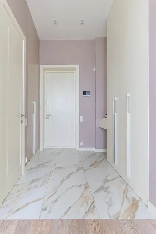 Коридор и прихожая: 5.3 м2. По обе стороны установлены шкафы для хранения, на полу плитка с подогревом видеодомофон.