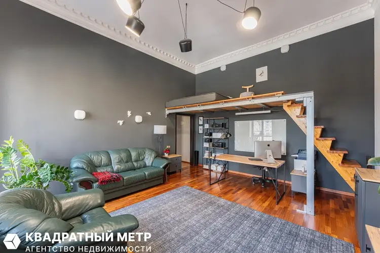 Две изолированные жилые комнаты: 25,5 м2 (гостиная) и 14,2 м2 (спальня). Кухня-столовая 10,5 м2. Высота потолков 4 метра — невероятный объем воздуха, который невозможно передать фотографиями. Дополнительные антресольные зоны (с высотой 2 метра) — под кабинет или лаунж. Гардеробная в 4 метра с лестничным блоком.
