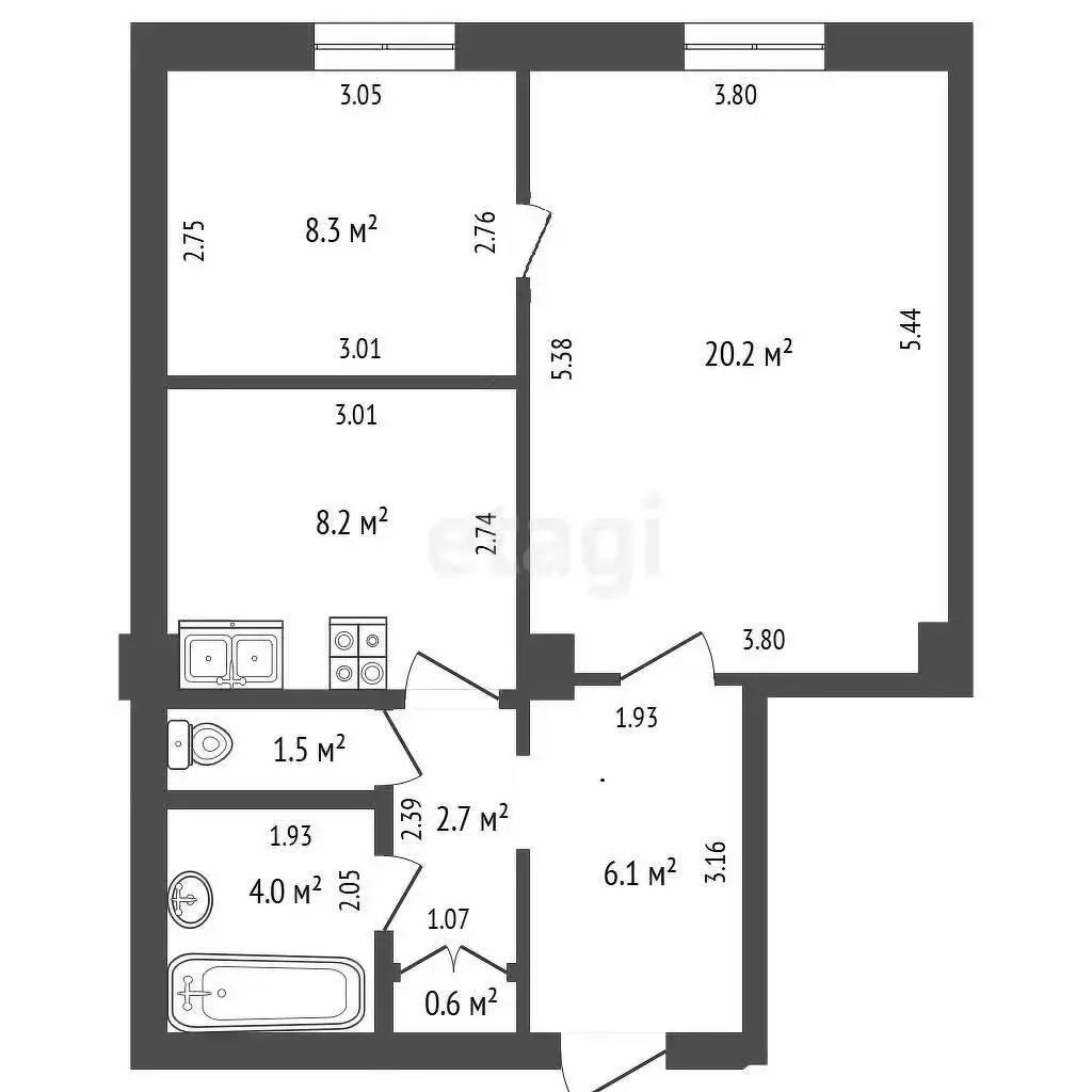 · Зал: 20,2 м2 (с большим шкафом-купе)