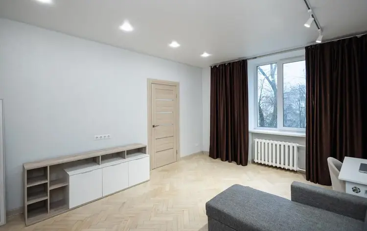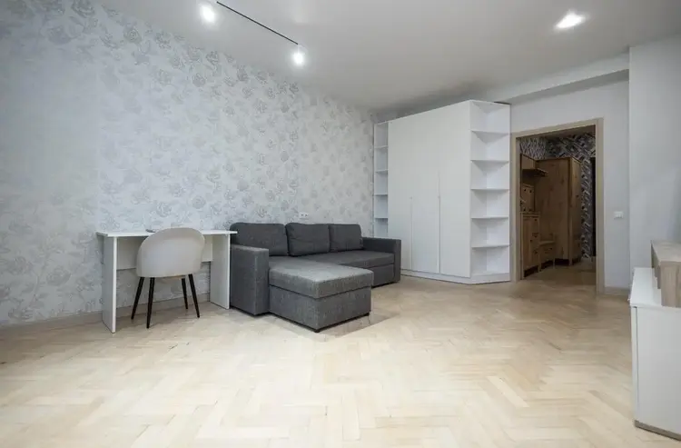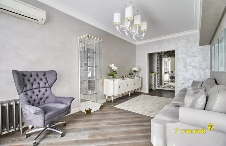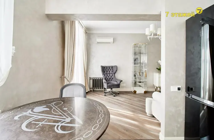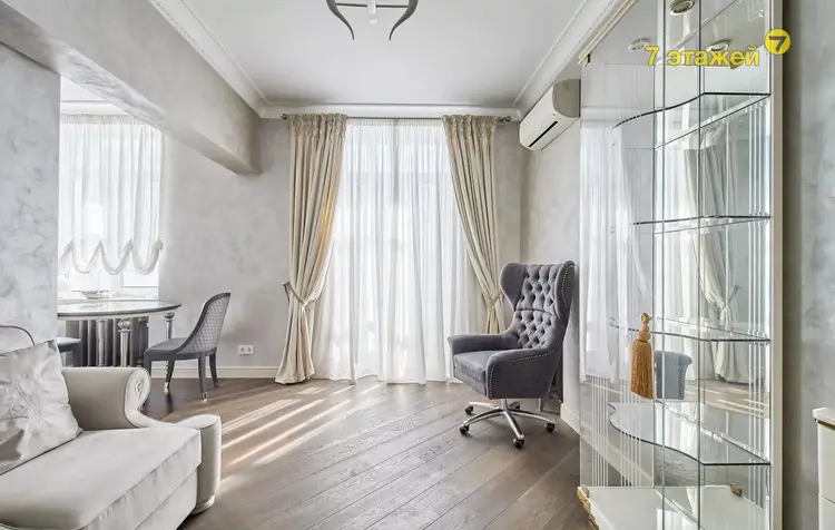 В квартире выполнен дорогостоящий, эксклюзивный ремонт из премиальных отделочных материалов. установлена металлическая входная дверь, а также видеодомофон. Потолки выровнены и оштукатурены без потери его высоты, а также задекорированы гипсовой лепниной под стать эпохе дома. На полу уложена паркетная доска под маслом, плинтуса из прочного окрашенного мдф. Стены оформлены экологичной, стойкой декоративной штукатуркой итальянского производителя, спальня выделена роскошными, изысканными обоями. Гардеробная собрана из мдф в приятном кремовом оттенке. Отдельностоящая мебель индивидуального изготовления и бытовая техника остаются по согласованию с собственником.