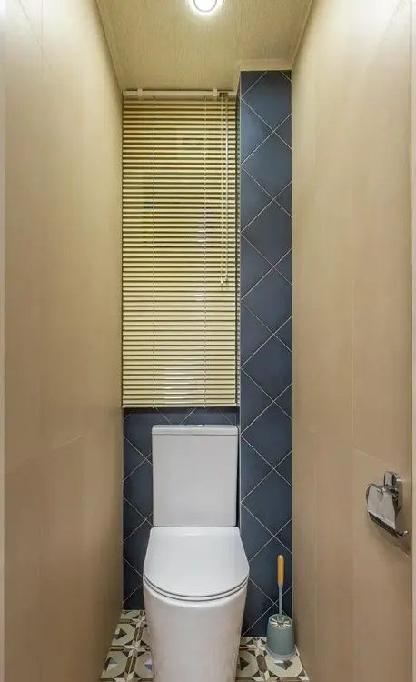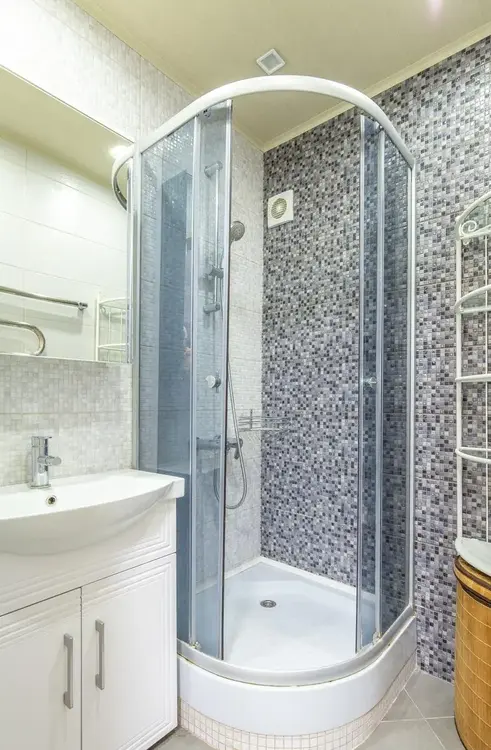 Раздельный санузел облицован плиткой, установлена душевая кабина, зеркало со шкафчиком, современные смесители, напольный унитаз.
