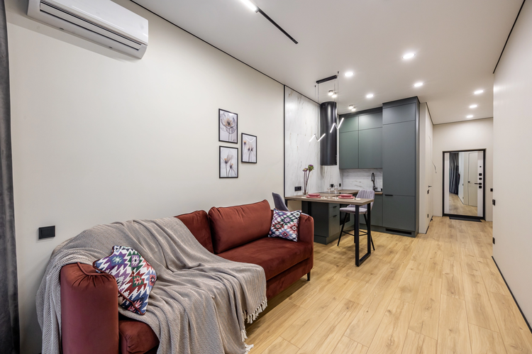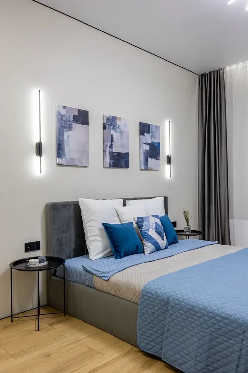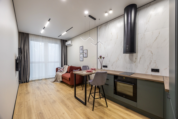 Панорамный вид на город и зелёный массив создаёт ощущение пространства и уюта. Скрытые двери высотой 2.30, покраска стен, керамогранит и премиальный ламинат Egger Eversense 34 класс 72 часа аква, формируют современную эстетику.